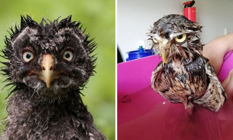 As corujas molhadas revelam um lado totalmente diferente e surpreendente. Suas penas encharcadas mudam completamente sua aparência, transformando essas aves elegantes em versões curiosamente desajeitadas e, muitas vezes, com expressões que parecem puro arrependimento.