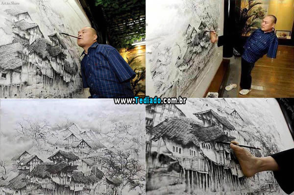 O artista chinês Huang Guofu pinta usando apenas a boca e os pés