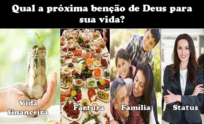 Se você deseja saber um pouco mais do que Deus tem preparado para você e está lhe enviando, este teste pode lhe oferecer algo muito interessante. O que você precisa fazer é escolher uma das áreas da vida representadas pelas imagens abaixo. A primeira imagem simboliza a vida financeira; a segunda, a fartura; a terceira, a vida familiar; e a quarta, o status.