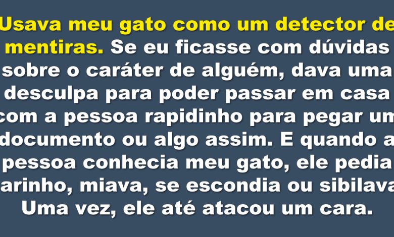 Usava meu gato como um detector de mentiras. Se eu ficasse com dúvidas sobre o caráter de alguém, dava uma desculpa para poder passar em casa com a pessoa rapidinho para pegar um documento ou algo assim. E quando a pessoa conhecia meu gato, ele pedia carinho, miava, se escondia ou sibilava. Uma vez, ele até atacou um cara. Mais tarde, descobri que esse homem tinha um sério transtorno mental. Meu bichano serviu fielmente como “detector” por 18 anos. Nunca se enganou!