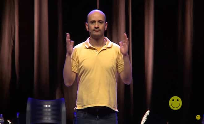 Regra: Dois jogadores improvisam uma cena de um programa de entrevista. Outro jogador faz a tradução para surdos do que eles estão falando.