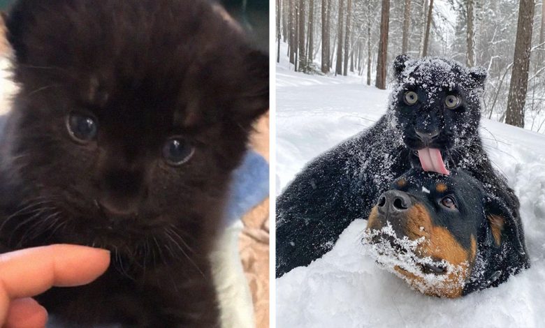 Pantera rejeitada pela mãe conquista internet ao lado do irmão Rottweiler