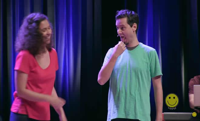 Regra: Os jogadores se dispõe no palco em forma de quadrado. A dupla à frente improvisa uma cena com tema dado pela plateia. A cada vez que o MC toca a campainha, o quadrado gira e a dupla à frente faz outra cena com o mesmo tema. Quando as duplas começam a se repetir, eles continuam a mesma cena que estavam fazendo. As estórias tem que ter começo, meio e fim.