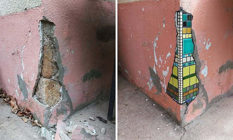 Artista conserta calçadas, buracos e edifícios rachados usando mosaicos vibrantes (30 fotos)