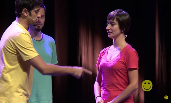 Regra: Os jogadores se dispõe no palco em forma de quadrado. A dupla à frente improvisa uma cena com tema dado pela plateia. A cada vez que o MC toca a campainha, o quadrado gira e a dupla à frente faz outra cena com o mesmo tema. Quando as duplas começam a se repetir, eles continuam a mesma cena que estavam fazendo. As estórias tem que ter começo, meio e fim.