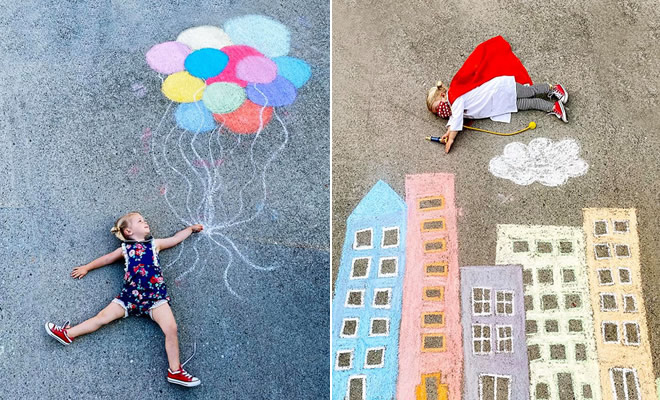 Abbey Burns Tucker começou uma série de fotos em sua página no Facebook, mostrando uma variedade de situações divertidas e lúdicas nas quais suas filhas interagem com os desenhos no concreto. Não é de admirar que essas fotografias coloridas tenham atraído milhares de curtidas e centenas de comentários de pessoas nas mídias sociais.