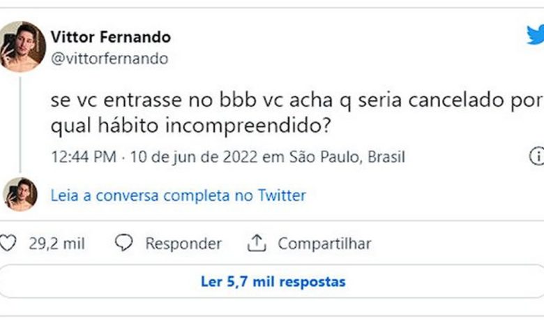 Um dos maiores medos de quem entra no “BBB” – e de qualquer outro mortal – é ser cancelado nas redes sociais. Pensando nisso, o influenciador Vittor Fernando perguntou a seus seguidores no Twitter por qual “hábito incompreendido” eles acreditam que seriam cancelados no reality.