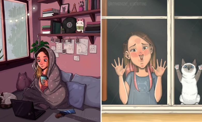 Se você clicou neste post com base no título, vamos supor que você é uma pessoa de gatos e que veio ao lugar certo! Dito isso, hoje gostaríamos de mostrar as novas ilustrações de uma artista húngara chamada Rita Vigovszky. O trabalho de Rita apresenta principalmente seus gatos, que são um dos animais de estimação mais populares. Em tempos em que muita gente encontra conforto nos animais de estimação e também se conecta com eles em um nível mais profundo, a artista usa seu talento para explorar a relação entre gatos e seus donos.