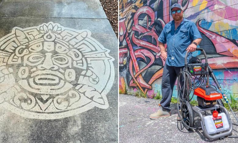 Entramos em contato com Sam para saber mais sobre seu trabalho criativo. Perguntamos como ele percebeu pela primeira vez o potencial artístico de uma lavadora de alta pressão. Descobrimos que: “Quando as escolas fecharam devido à COVID e meus filhos ficaram presos em casa, comprei uma caixa enorme de giz de calçada com planos de colorir toda a entrada da garagem. Mas antes de fazermos isso, achei que deveria lavar a entrada da garagem primeiro.