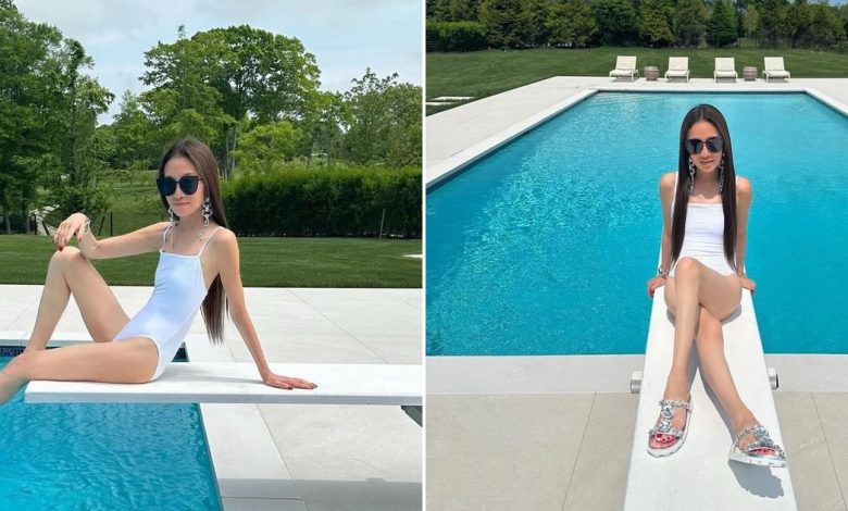 Em uma série de fotos compartilhadas no Instagram, Vera Wang modelou um maiô branco de alças finas e decote quadrado. Seu visual exalava elegância, sendo complementado por brincos pendentes que chegavam até as clavículas, uma pulseira brilhante e sandálias com joias, adicionando um toque de brilho dos pés à cabeça.