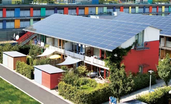 Cinquenta e duas casas, entre residenciais e comerciais, formam o bairro ancorado em Freiburg, na Alemanha, que se tornou referência em boa vida e impacto ambiental mínimo. Situado em uma das regiões mais ensolaradas do país, o vilarejo de Sonnenschiff é capaz de produzir quatro vezes mais energia do que consome. A auto-suficiência é atingida através do seu projeto de energia solar, que utiliza painéis fotovoltaicos posicionados estrategicamente para aproveitar ao máximo a incidência dos raios de sol. Além de aproveitar a luz natural, com amplas aberturas para deixar o sol entrar nos ambientes internos, as casas ecológicas também contam com tecnologia para economizar água. Os telhados possuem sistemas de captação de água da chuva, que depois é utilizada na irrigação de jardins e nas descargas de vasos sanitários, diminuindo ainda mais o impacto no ambiente.