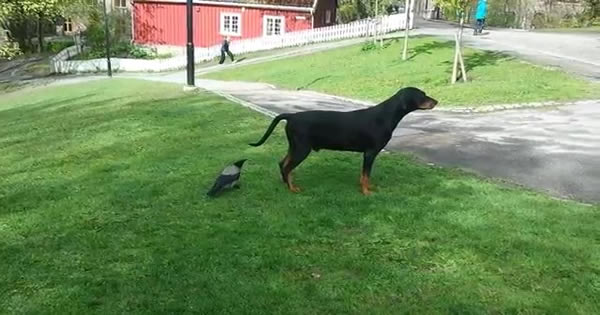 No reino animal também existe aqueles bicho chato, veja o exemplo desse corvo que quer perturbar o cachorro.