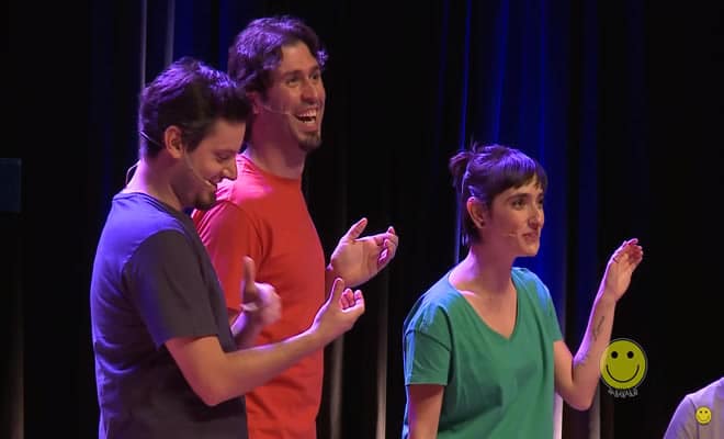 Regra: Com inspiração no estímulo sonoro proporcionado pelo músico, os jogadores deverão iniciar uma cena. No meio da cena, o mestre de cerimônias toca a campainha e menciona o título da cena baseado em uma frase sugerida pela plateia e os jogadores tem que justificar esse título na cena que faziam antes. Depois de mencionado o título, nenhum outro jogador poderá entrar na cena.