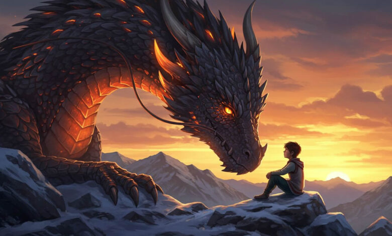 O dragão se aproximou. Seus olhos se encontraram com os do menino, e ali, por um instante eterno, não havia criatura e criança — apenas duas almas cansadas da perda.