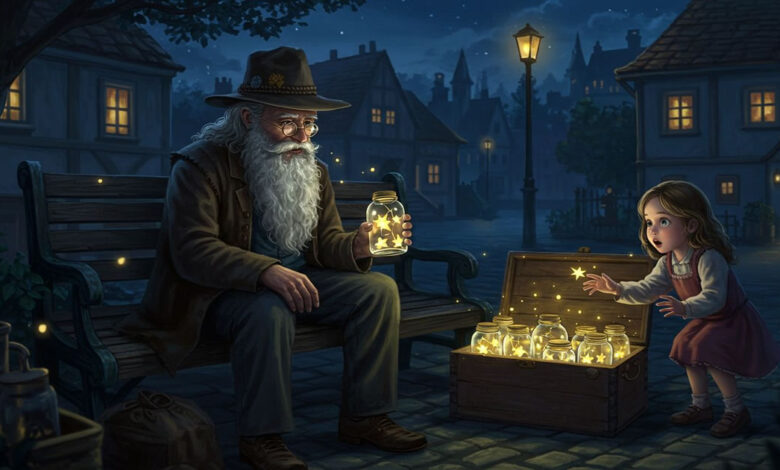 Era um senhor de barba branca e longa, olhos brilhantes como brasas, e um chapéu gasto que parecia carregar décadas de histórias. Todas as noites, quando a lua surgia, ele surgia também — sempre no mesmo banco, com uma caixa de madeira ao lado. Dentro dela, dezenas de potinhos de vidro reluziam discretamente, como se escondessem pequenas faíscas.