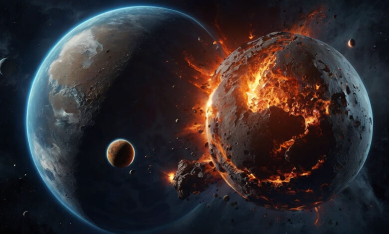 A teoria mais aceita sobre a origem da Lua é a do Grande Impacto — a ideia de que ela teria se formado após a colisão entre a Terra primitiva e um corpo do tamanho de Marte, conhecido como Theia.