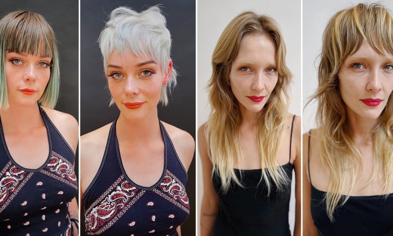 Por exemplo, uma de suas recentes obras-primas apresenta uma mulher com longos e sedosos cabelos pretos, realçados por franjas nítidas e bem definidas. Este visual captura uma elegância atemporal, reminiscente da moda clássica dos anos 60. Em um contraste impressionante, mas igualmente cativante, temos outra cliente com cabelos cor-de-rosa, ostentando um corte brincalhão e ousado com franjas desfiadas, irradiando o espírito livre dos anos 70. Esses exemplos de imagens não apenas evidenciam as habilidades de Jayne, mas também seu compromisso em resgatar a estética icônica das décadas passadas, com as franjas desempenhando um papel central em cada transformação.
