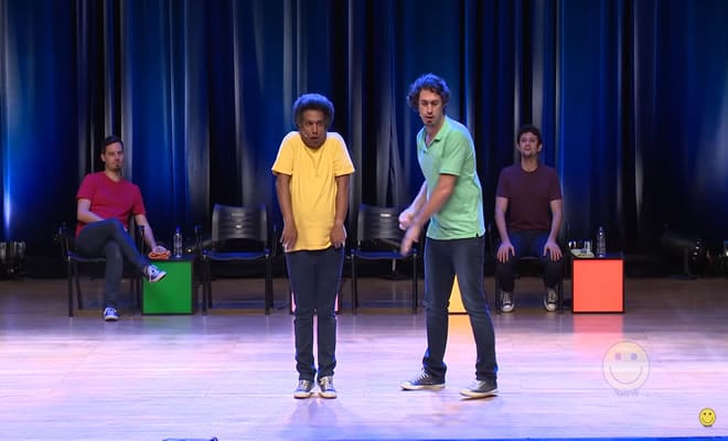 Regra: Os jogadores irão começar uma cena, e quando o mestre de cerimônias mandar, deverão avançar ou recuar a cena, representando todas as falas e movimentos como nas teclas de avançar e recuar do controle remoto.