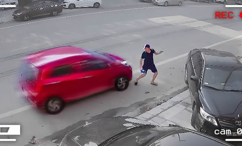 Um homem estava andando pela rua quando percebeu que um carro vinha em sua direção a toda velocidade e decidiu pular por cima dele. O carro desviou e o errou por centímetros, mas felizmente para ele, ele caiu no capô e deslizou para o chão sem se machucar.