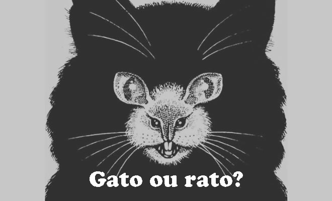 Truque para enxergar: Um gato preto de longe, um rato ao centro, no nariz do gato.