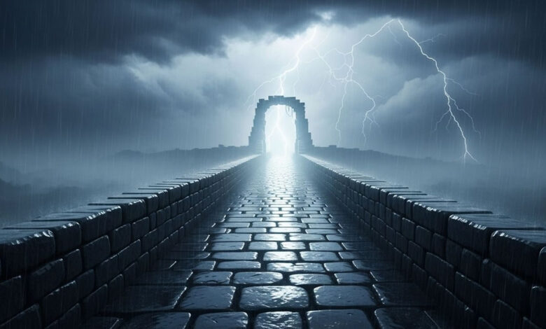 Não era de concreto, nem de madeira. Os arcos, feitos de pedra negra, brilhavam como se estivessem molhados por dentro, e a estrutura se erguia no meio do vazio, conectando o nada a um horizonte enevoado. A cada trovão, a ponte parecia pulsar, viva.