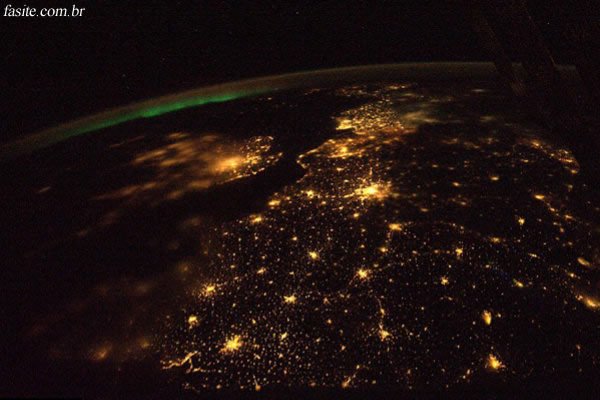 A Nasa divulgou uma imagem tirada da Estação Espacial Internacional que mostra a aurora boreal ao norte da Grã-Bretanha e, numa noite de céu desobstruído por nuvens, o aglomerado de luzes artificiais das cidades de Londres e Paris.