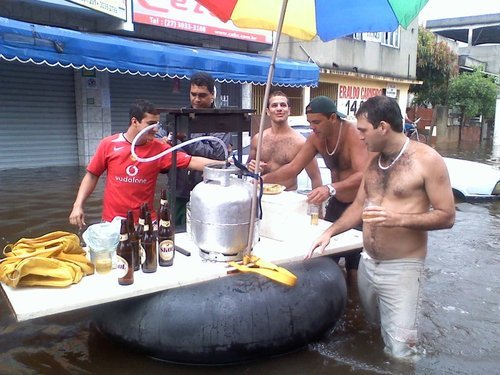 Nem sempre uma enchente é algo horrível. Ter seus móveis, seu carro, sua casa, seus filhos levados pela enchente não precisam ser encarados como o fim do mundo. Pense pelo lado bom da coisa. Pode ser uma boa hora pra consertar o telhado por exemplo, já que você sabe que não vai morrer se cair. Tem várias coisas legais que podem ser feitas durante uma enchente, listamos 10, veja: 1 – Tentar descobrir a diferença entre cólera e leptospirose apenas pelo som da sua tosse. 2 – Montar novas versões de antigas adivinhas como “O que vem em pé e corre deitado?” (Resposta: ônibus na enchente). 3 – Brincar de pique-tubarão, pirâmide humana e pólo aquático dentro do seu quarto. 4 – Subir na laje da casa para ver sua vizinha de camiseta molhada. 5 – Ficar contando quantas velhinhas são levadas pela correnteza. churras-nagua 6 – Jogar adedanha com nomes de música que contenham a palavra “chuva” enquanto espera a Defesa Civil. 7 – Brincar de “Será que isso bóia?” com os móveis da sua casa. 8 – Fazer um bolão para ver qual helicóptero chegará primeiro: o do Datena, do Repórter Cidadão ou o do Domingo Legal. 9 – Mostrar para uma criança o espaço vazio que ficou no meio de uma favela depois que os barracos desabaram e falar que é pegada de Godzilla. 10 – Começar um negócio de hidroginástica de baixo custo nas regiões alagadas.