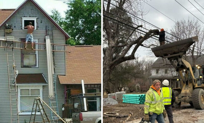 Este artigo reúne algumas fotos que expõem exatamente esse lado surreal do cotidiano profissional. São situações que misturam imprudência, criatividade questionável e uma confiança que beira o sobrenatural. De trabalhadores equilibrando-se em escadas improvisadas com múltiplos apoios até o uso de ferramentas potentes sem qualquer tipo de proteção, cada imagem faz o coração acelerar — e não de emoção positiva.
